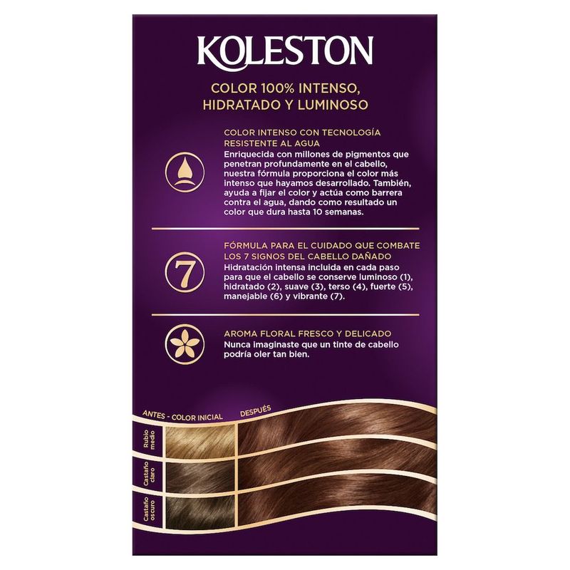 Color Intenso con tecnología resistente al agua.Nuestra tecnología resistente al agua ayuda a fijar el color y actúa como barrera contra el agua dando como resultado un color que dura hasta 10 semanas. Enriquecida con millones de pigmentos matizadores que penetran profundamente el cabello,nuestra formula ayuda a neutralizar los tonos naranjas y amarillos no desados hasta por 10 semanas. Tecnología dual de restauración para un brillo extraordinario. Ayuda a reparar cada fibra desde el cabello hasta el interior,mientras suaviza la superficie del cabello, aumentando el reflejo de la luz, para un brillo increíble.