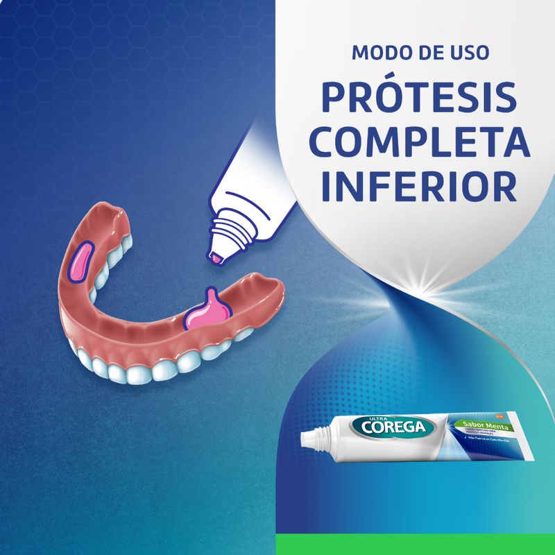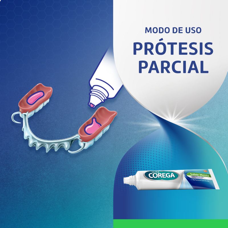 El adhesivo para prótesis dentales Ultra Corega Crema sabor menta 70g. fija la prótesis hasta por 12 horas. Además forma un sello entre la prótesis y la encía ayudando a evitar la entrada de partículas de comida.