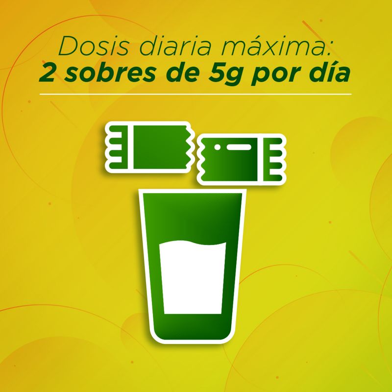 Dosificación. Adultos y niños mayores de 12 años: cuando aparezcan los síntomas, tome el contenido de un sobre disuelto en agua (mínimo un vaso) o 1 cucharadita de té (5 gramos) disuelto en agua. Una segunda dosis puede ser tomada luego de 2-3 horas. No tome la segunda dosis antes de las 2 horas de haber tomado la primera. No tomar más de 2 veces por día. No usar en niños menores de 12 años. Dosis máxima diaria: 2 sobres o 2 cucharaditas de té por día.