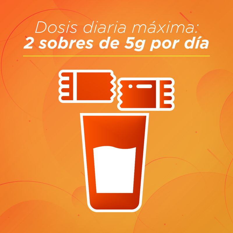 Dosificación. Adultos y niños mayores de 12 años: cuando aparezcan los síntomas, tome el contenido de un sobre disuelto en agua (mínimo un vaso) o 1 cucharadita de té (5 gramos) disuelto en agua. Una segunda dosis puede ser tomada luego de 2-3 horas. No tome la segunda dosis antes de las 2 horas de haber tomado la primera. No tomar más de 2 veces por día. No usar en niños menores de 12 años. Dosis máxima diaria: 2 sobres o 2 cucharaditas de té por día.