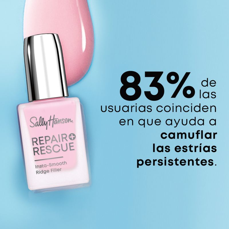 La Base Alisadora Pre Color Sally Hansen Repair + Rescue es una prebase autonivelante para uñas. Rellena al instante las marcas y disimula las imperfecciones de las uñas. Nuestra fórmula, con ácido hialurónico, crea un efecto voluminizador en las uñas. Hidrata, suaviza y deja las uñas con una apariencia uniforme. Uñas con un aspecto más saludable y alisadas al instante. Uñas con un aspecto perfecto, hidratadas y restauradas.