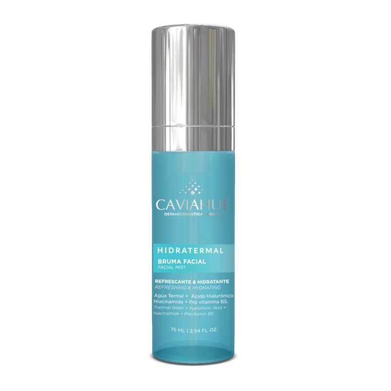 Bruma facial hidratante y refrescante con Agua Termal Caviahue, Niacinamida y Ácido Hialurónico. Hidrata la piel de forma inmediata y sostenida, aportando frescura, confort y luminosidad, incluso en pieles sensibles.