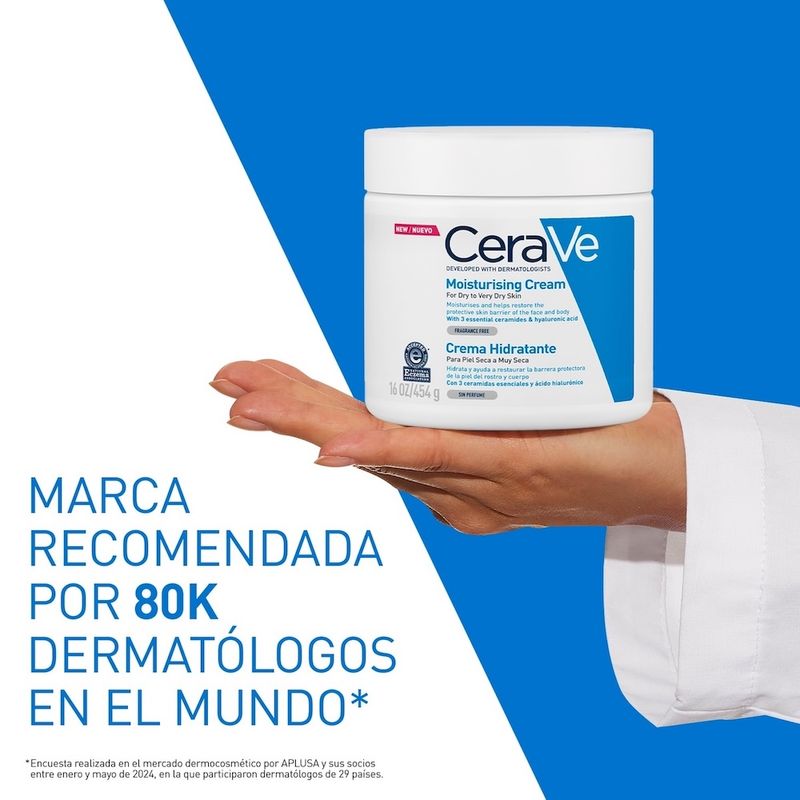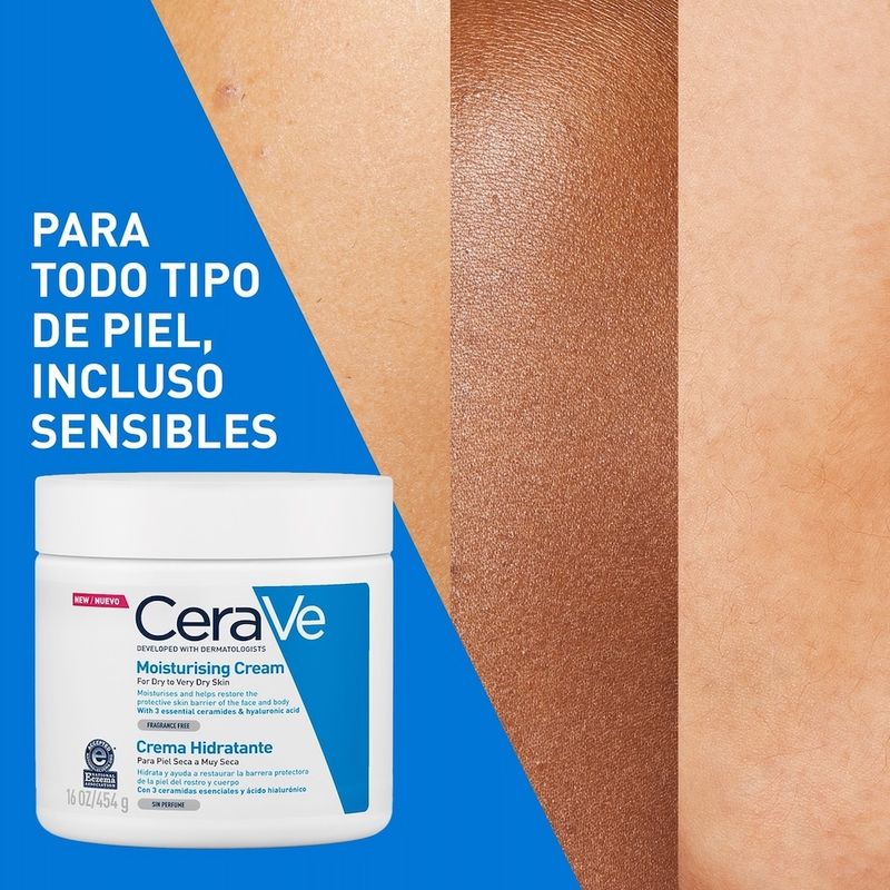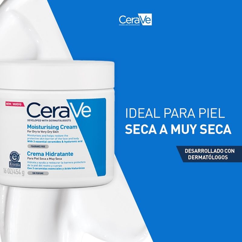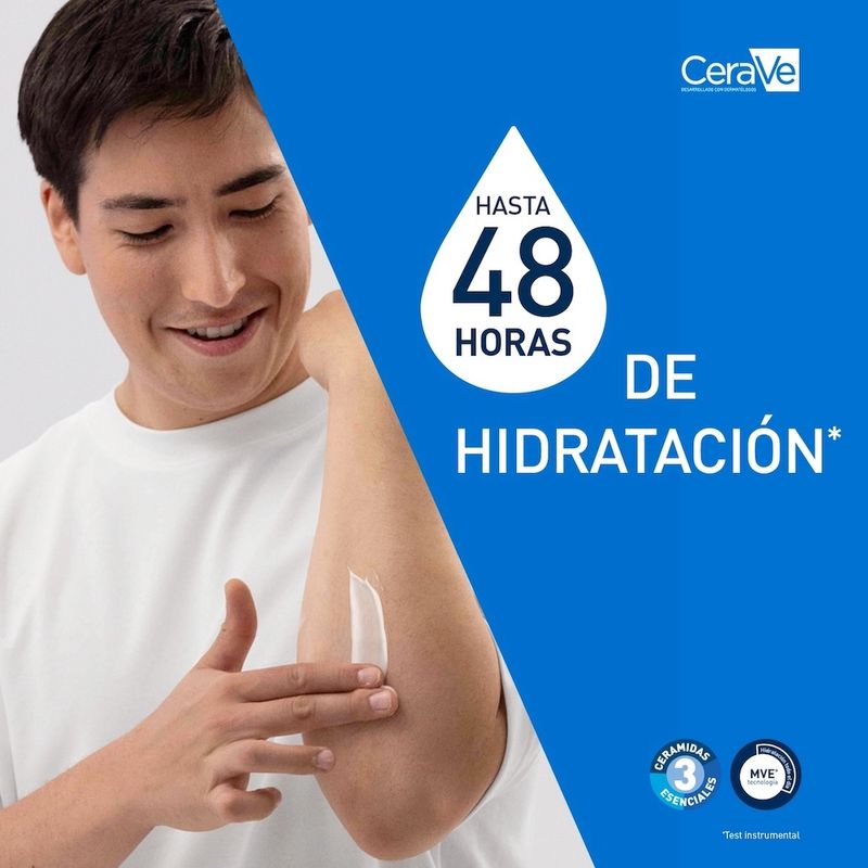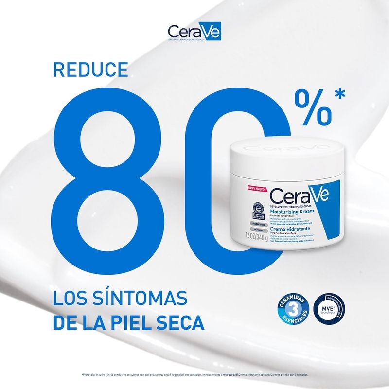 La Crema Hidratante CeraVe es la solución para una hidratación profunda y duradera. Formulada por dermatólogos, esta crema rica y nutritiva es ideal para la piel seca, ofreciendo hidratación durante 48 horas, tanto en el rostro como en el cuerpo. Su secreto reside en la innovadora Tecnología MVE®, que libera de forma gradual y continua una potente combinación de 3 ceramidas esenciales, restaurando y fortaleciendo la barrera protectora natural de tu piel capa por capa. La piel se siente hidratada, suave y flexible, con un acabado aterciopelado. Gracias a la inclusión de ácido hialurónico y glicerina, esta crema no solo hidrata la superficie, sino que penetra en profundidad, nutriendo cada pequeño pliegue para una comodidad duradera. Como resultado, mejora hasta en un 80% la sequedad de la piel y disminuye hasta en un 60% la comezón*. Su fórmula sin fragancia y no comedogénica es excelente para las pieles más sensibles, siendo hipoalergénica y apta para toda la familia. Estudio clínico de 4 semanas en 49 mujeres de 30 a 65 años, con piel seca a muy seca.