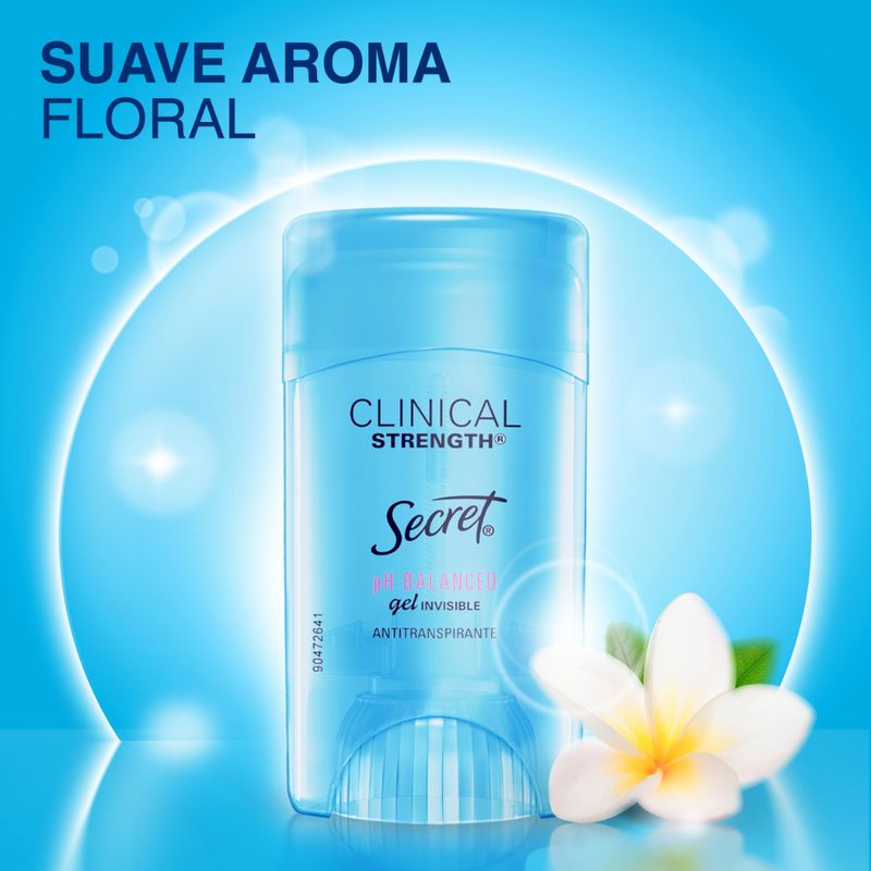 El Antitranspirante Desodorante Secret Clinical Strength pH Balanced en Gel Invisible, ha sido clínicamente comprobado. Al aplicarlo, experimentarás una sensación de frescura. Se absorbe rápidamente, brindando una protección extrema de larga duración contra el mal olor y la sudoración. Su aplicación transparente en gel, ¡no deja manchas blancas al aplicarlo! Siéntete protegida y fresca todo el día.