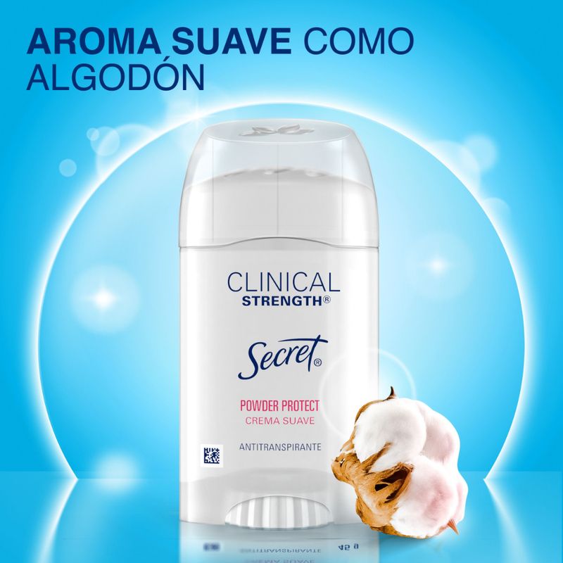 El Antitranspirante Desodorante Secret Clinical Strength en crema suave Powder Protect, ha sido clínicamente comprobado. Su textura suave y cremosa brinda una protección extrema de larga duración contra el mal olor y la sudoración mientras cuida tu piel. Además, tiene un suave aroma como algodón. Siéntete protegida y fresca todo el día.