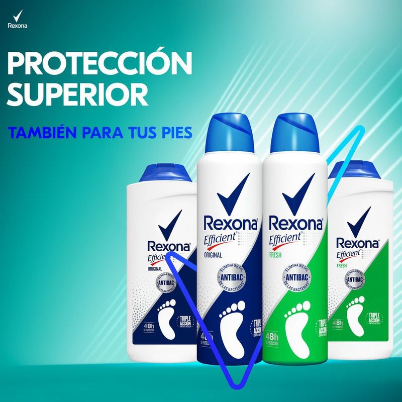 Los pies son la parte del cuerpo que más se mueve, la que más se esfuerza, pero también la menos reconocida, nunca se llevan la gloria. Es hora de reinvindicarlos, de mantener frescos y secos a los pies. Esa parte del cuerpo que transpira 4 veces más que las axilas. Rexona Efficient. La protección que conocés, también para los pies. Rexona. No te abandona. Beneficios: