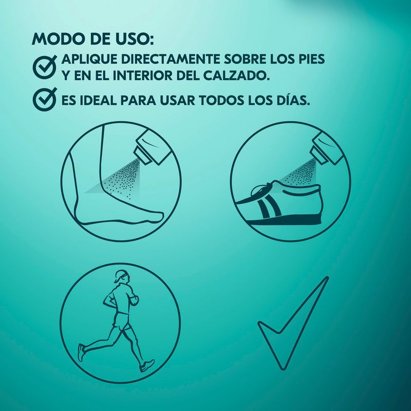 Modo de uso: no aplicar sobre piel excesivamente húmeda, irritada o lastimada. Aplicar solamente en las axilas a no menos de 15 cm de la piel.