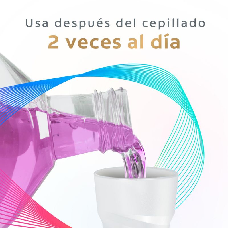 Llená la tapa hasta la línea continua (20mL). No lo diluyas en agua. Usá después del cepillado dos veces al día. Enjuagá por 30 segundos. Eliminá el producto de la boca.