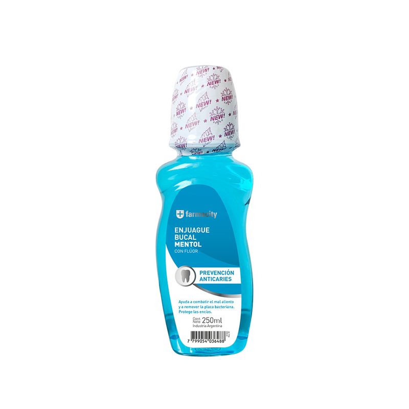-Enjuague bucal Farmacity sabor menthol, ayuda a combatir el mal aliento y a remover la placa bacteriana. Contiene flúor. Refresca el aliento en cada enjuague.