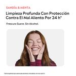 LISTERINE® SANDIA Frescura Suave. Fórmula exclusiva con agentes antibacterianos que eliminan hasta el 99,9% de los gérmenes que causan placa, gingivitis y mal aliento en solo 30 segundos. La innovadora combinación de los cuatro aceites esenciales de LISTERINE® (Timol, Eucalipto, Mentol y Salicilato de Metilo) actúa sobre las bacterias escondidas en lo más profundo de la boca. Comprobado por Odontólogos.