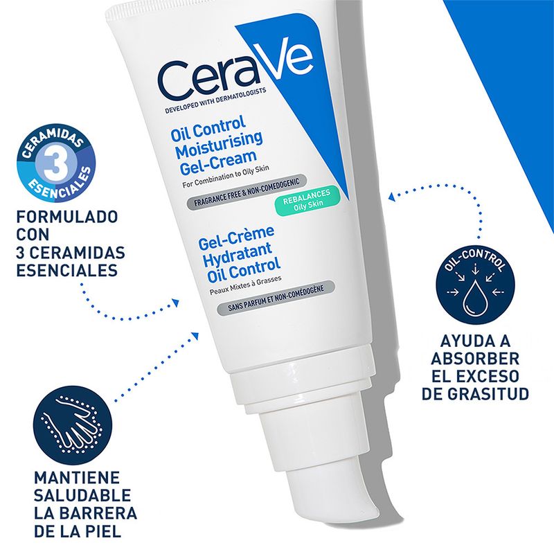 Gel-Crema Hidratante para controlar la grasa y matificar la piel. CeraVe Oil Control Gel-Crema Hidratante es una hidratante ultra-ligera que ayuda a absorber el exceso de sebo para que la piel se vea matificada todo el día. Formulada para pieles mixtas a grasas, permite rebalancear la piel, hidratándola hasta por 48 horas*. Con fórmula ultra-ligera, tiene una absorción rápida dejando un acabado mate, sin sensación grasosa. Desarrollado con dermatólogos, contiene una Tecnología Oil Control, 3 Ceramidas esenciales, Ácido Hialurónico y Niacinamida, además de la Tecnología MVE para proporcionar una hidratación continua. Es de fácil aplicación y ayuda a restaurar la barrera protectora de la piel. Fórmula no comedogénica, es decir, no obstruye los poros. Libre de aceite, fragancias y parabenos. Prueba instrumental *Beneficios •La piel se ve matificada durante todo el día.? Hidratación hasta por 48 horas*? •Textura ultra-ligera de rápida absorción, no deja sensación grasosa. •Tecnología de control de sebo: sílice y otros polvos para ayudar a absorber el exceso de grasa. •3 Ceramidas esenciales para ayudar a restaurar y mantener la barrera natural de la piel. •Ácido hialurónico para mantener el equilibrio de humedad en la piel. •Ayuda a dar a la piel una textura suave y tersa. •Niacinamida para ayudar a calmar la piel. •Tecnología MVE para una hidratación continua. •Probado en piel sensible, no comedogénico, libre de fragancias y alcohol, lo que la hace adecuada para piel sensible. modo de uso 1. Aplicar generosamente sobre el rostro y el cuello por la mañana y por la noche después de la limpieza o según las indicaciones de tu dermatólogo?. 2.Por la mañana, continúa con un protector solar de amplio espectro?.