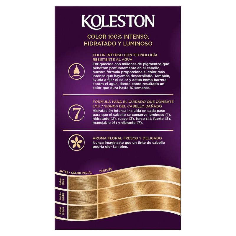 PRIMER PASO: Mezcla? Antes de comenzar, por favor colócate los guantes protectores (4) que se adjuntan.? Quita la punta de Koleston Emulsión Activadora del Color (2) y desenrosca la tapa.? Exprime el contenido entero del tubo de Koleston Tinte Coloración en Crema (1) en el envase Koleston Emulsión Activadora del Color (2) y ajusta la tapa.? Coloca el dedo con el guante puesto sobre la punta del frasco aplicador(2). Mezcla el contenido del frasco hasta que esté completamente homogéneo y la mezcla esté espesa.? Utiliza la mezcla de inmediato.? No dejes la mezcla en un frasco cerrado. Una vez mezclado, se puede producir expansión del recipiente o estallido. SEGUNDO PASO SI ES LA PRIMERA APLICACIÓN: Aplicación de la mezcla preparada. Es ideal para quienes no se han teñido el cabello o para quienes no se lo tiñen/tinturan hace 3 meses o más. También es conveniente para aquellas que quieren cambiar de tono. Aplica por secciones la mezcla preparada. Si tienes canas resistentes asegúrate de comenzar por esa área. Aplica todo el contenido de la botella. El color de la mezcla no corresponde al color que deseas. Para obtener un mejor resultado deja la mezcla en tu cabello por 40 minutos o por el tiempo que sea indicado con la Prueba del Mechón. SEGUNDO PASO SI ES UNA APLICACIÓN POSTERIOR O RETOQUE DE RAÍZ: Aplicación de la mezcla preparada Es conveniente si tu cabello ya ha sido teñido/tinturado y las nuevas raíces están comenzando a aparecer. Separa tu cabello con la punta de la botella y aplica ¾ de la mezcla en tus raíces y déjala por 30 minutos, ó por 10 minutos menos de lo indicado en la Prueba del Mechón. Distribuye el resto de la mezcla por todo el cabello y deja por otros 10 minutos. Nota: Para Koleston tonos: 120 ó 121, deja el tinte/tintura de 40 a 45 minutos. Distribuye el resto de la mezcla por todo el cabello y déjala por otros 10 minutos. TERCER PASO: Enjuaga Después del tiempo de exposición, enjuaga tu cabello con una pequeña cantidad de agua tibia masajeándolo suavemente hasta producir espuma. Luego enjuaga con abundante agua tu cabello hasta que se vea limpia. No es recomendable usar shampoo. CUARTO PASO: Aplicación del Tratamiento Gloss Intenso Acondicionador para el cabello* Instrucciones: Asegúrate que no queden residuos del tinte Coloración en Crema (1) en tu cabello. Masajéalo con una cantidad del Tratamiento Gloss Intenso Acondicionador para el cabello* (3) en tu cabello húmedo y déjalo por aproximadamente 2 minutos. Luego enjuaga tu cabello de nuevo. El tubo ofrece la cantidad suficiente para 3 aplicaciones, una cada 2 semanas. Usa una porción justo después de la coloración y las demás, úsalas una cada 2 semanas después de usar shampoo para un óptimo color, brillo y suavidad. Para medir la cantidad que debe usarse en cada porción, presiona el tubo desde el final hasta la próxima marca. El cabello liso o corto puede que necesite menos cantidad del Tratamiento Gloss Intenso Acondicionador para el cabello *. *El producto dependerá del tono a utilizar, Koleston Tratamiento Gloss Intenso Acondicionador para el cabello o Koleston Tratamiento Gloss Intenso Ultra Acondicionador para el cabello.