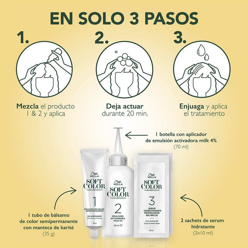 Soft Color es el tinte sin amoníaco de Wella, perfecto para ti que quieres tener un color más brillante y un cabello sedoso. Su sistema Multitratamiento está hecho de ingredientes naturales, suaves para los cabellos tratados químicamente, siendo así la forma más saludable de para teñir tu cabello.