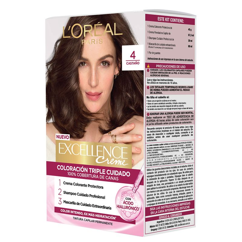 Si buscas una coloracion permanente, con 100% cobertura de canas y una rutina que cuide tu pelo, ¡Excellence es para vos! Excellence Creme Coloración Triple Cuidado enriquecida con Pro-Keratina, protege tu pelo antes, durante y después de la coloración. Cobertura de 100% de canas, para un color perfecto, radiente y duradero.