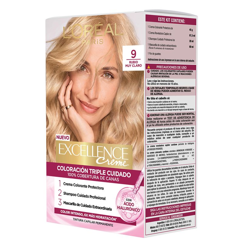 Si buscas una coloracion permanente, con 100% cobertura de canas y una rutina que cuide tu pelo, ¡Excellence es para vos! Excellence Creme Coloración Triple Cuidado enriquecida con Pro-Keratina, protege tu pelo antes, durante y después de la coloración. Cobertura de 100% de canas, para un color perfecto, radiente y duradero.