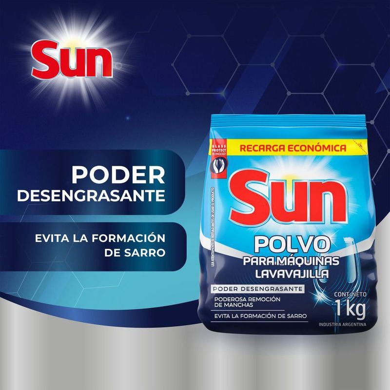Sun el polvo para máquinas lavavajillas es la solución perfecta para la remoción de manchas difíciles y prevención del sarro. La formulación ayuda a prevenir la deposición de una lámina de sales insolubles en la superficie de la vajilla, causada por aguas duras, y “captura” los iones de calcio para que no se adhieran a la superficie. Contiene surfactantes que disuelven las manchas de grasa y previenen la formación de manchas en la vajilla durante el proceso de secado. Contiene otros agentes de limpieza que permiten limpiar suciedades a base de almidón (arroz, papas, pasta, etc.) y suciedades a base de proteínas (huevo, leche, queso, etc.) Contiene agentes que ayudan a: proteger superficies delicadas, tales como plata, vidrio y aluminio. SUN POLVO LAVAVAJILLAS cuida la vajilla de vidrio de la corrosión y además, evita que las superficies de plata se oxiden tomando un color oscuro. Por último, contiene perfume para cubrir cualquier mal olor durante el proceso y fin de lavado. Para una limpieza completa, Sun Polvo para Máquinas lavavajillas debe ser acompañado de Sun Sal regeneradora (en el caso de aguas duras) y Sun Abrillantador que ayuda a ablandar el agua, optimizando los resultados. Información complementaria: mantenga fuera del alcance de los niños y animales domésticos. Evite el contacto prolongado con la piel. Después de utilizar este producto, lave y seque las manos. En caso de contacto con ojos y/o piel, lave inmediatamente con abundante agua. En caso de ingestión, no provoque el vómito y consulte inmediatamente al Centro Nacional de Intoxicaciones o al Médico llevando el envase o rótulo del producto.