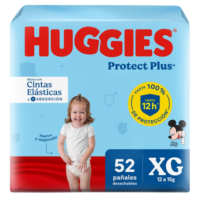 Pañales Huggies® Protect Plus Sequito toda la noche cuentan con Barreras de contención más gruesas*, Tecnología Xtra-Protect con canales de rápida absorción, mejores barreras anti filtraciones y gel súper absorbente para mantener a tu bebé sequito por más tiempo. Cuentan con orejas que se abren y se cierran y vienen con divertidos diseños de Mickey y sus amigos! *vs Huggies Protect Plus anterior.