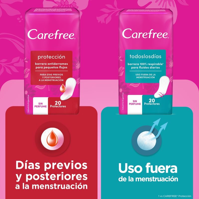 Los protectores diarios CAREFREE Todos los Días Tanga son ideales para ser usados durante los 21 días que no estás en tu periodo menstrual. Tienen una exclusiva tela micro porosa que permite que el aire pase 3 veces más* que con un protector diario convencional y así puedas dejar que tu piel respire naturalmente. *comparado con CAREFREE Protección Los protectores CAREFREE Todos los Días Tanga están evaluados ginecológicamente para que puedas usarlos diariamente y te sientas limpia, fresca y súper cómoda con la mayor discreción. El formato tanga tiene mayor ajuste atrás porque tiene unas alitas que se adaptan y adhieren mejor a tu ropa interior. Además, su superficie es delicadamente suave porque está hecho con lo mejor del algodón y no tiene perfume. Contiene neutralizador de olores para que te sientas más segura todo el día, todos los días.