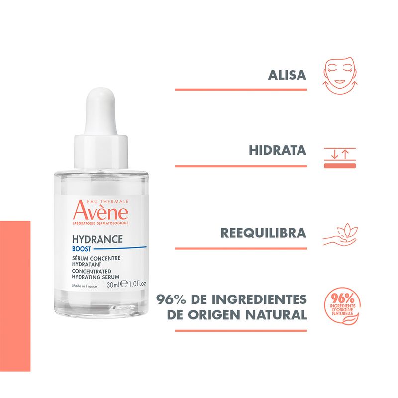 El sérum hidratante concentrado de Avene es una potente fórmula enriquecida con ácido hialurónico y vitamina B3, diseñada para proporcionar una hidratación intensa a la piel. Este auténtico booster de hidratación para el rostro ofrece una acción prolongada durante 48 horas, devolviendo el equilibrio a las pieles deshidratadas y sensibles. Con un 96% de ingredientes de origen natural, su innovadora fórmula refuerza la barrera de hidratación de la piel mientras respeta su equilibrio natural. La textura de agua gelificada, ultra ligera y fresca se absorbe fácilmente con un suave masaje de las yemas de los dedos, dejando una sensación acuosa en la piel, sin sensación grasa ni pegajosa. Hydrance Boost Sérum aumenta los niveles de hidratación para lograr una piel suave, luminosa y visiblemente saludable. Recupera el confort, la suavidad y la flexibilidad de tu piel con cada aplicación. Disfruta de una textura acuosa en gel, fresca y ultraligera que deja la piel perfectamente hidratada.
