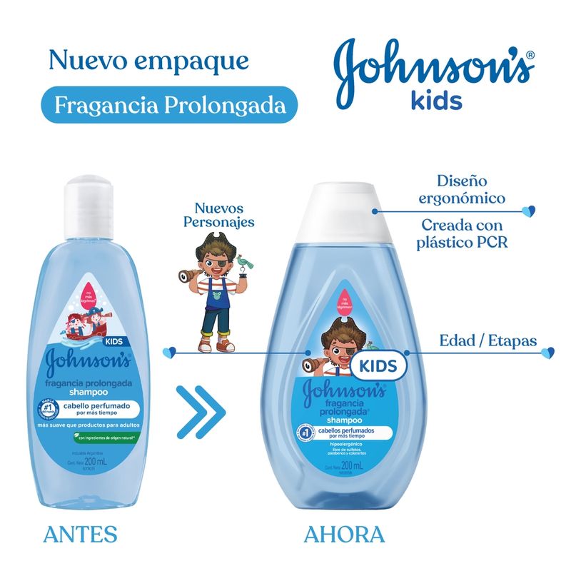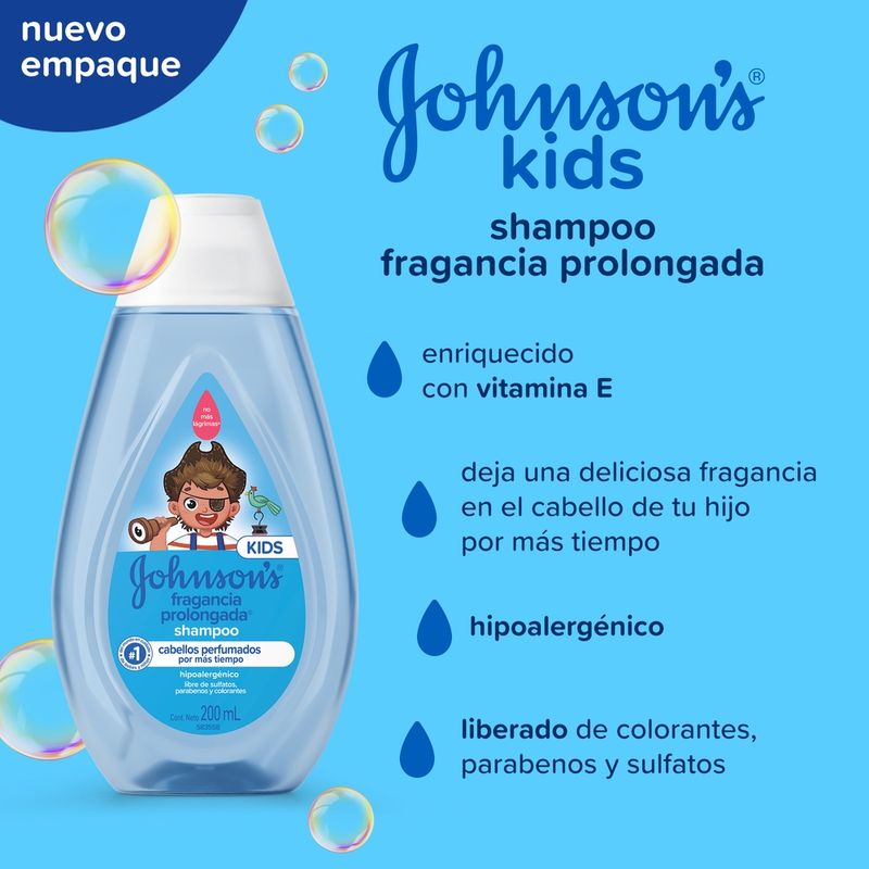 El Shampoo JOHNSON’S Fragancia Prolongada deja el cabello perfumado por más tiempo debido a su composición con vitamina E y tecnología de esencia FIX™. Tiene pH fisiológico, es hipoalergénico y es libre de colorantes, parabenos, sulfatos e ftalatos. Para cabellos aún más perfumados utilice también el acondicionador de la línea. Debe ser aplicado por un adulto o bajo su supervisión. No aplicar en cuero cabelludo que presente irritaciones. Adecuado para uso diario.