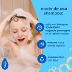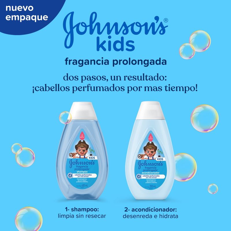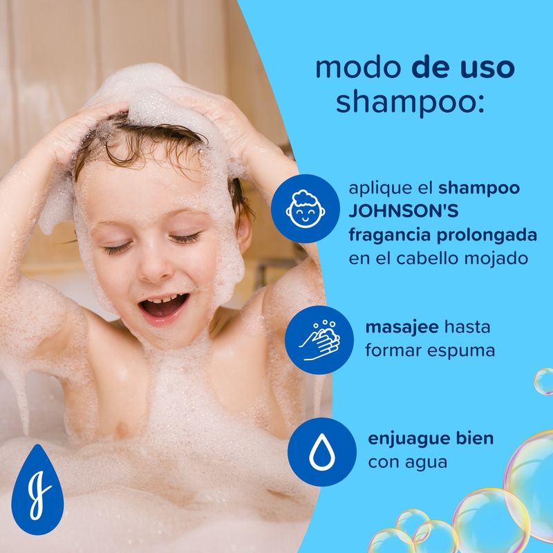 El Shampoo JOHNSON’S Fragancia Prolongada deja el cabello perfumado por más tiempo debido a su composición con vitamina E y tecnología de esencia FIX™. Tiene pH fisiológico, es hipoalergénico y es libre de colorantes, parabenos, sulfatos e ftalatos. Para cabellos aún más perfumados utilice también el acondicionador de la línea. Debe ser aplicado por un adulto o bajo su supervisión. No aplicar en cuero cabelludo que presente irritaciones. Adecuado para uso diario.