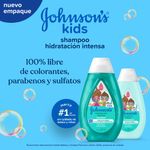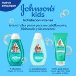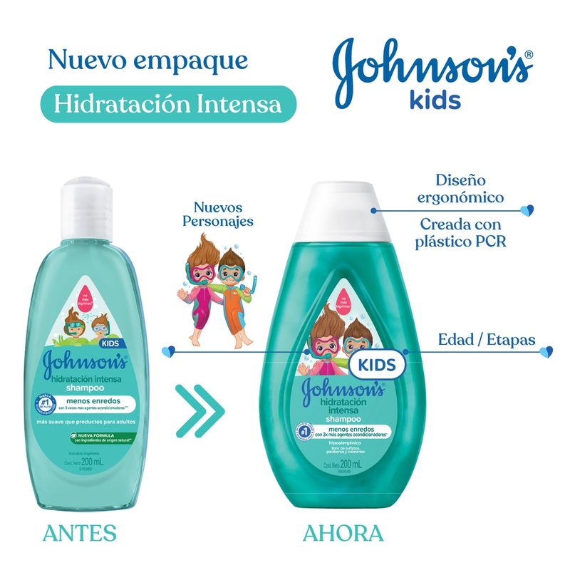 El Shampoo JOHNSONS Hidratación Intensa deja el cabello hidratado y fácil de peinar, gracias a su fórmula con 3 veces más agentes acondicionadores. Cuenta también con pH fisiológico, es hipoalergénico y libre de colorantes, parabenos, sulfatos y ftalatos. Los resultados son todavía mejores cuando se usa junto al shampoo de la misma línea. Debe ser aplicado por un adulto o bajo la supervisión de uno. No utilizar en caso de que el cuero cabelludo presente irritaciones. Adecuado para su uso diario.