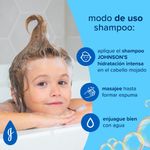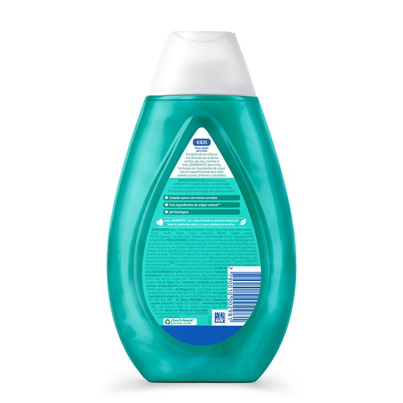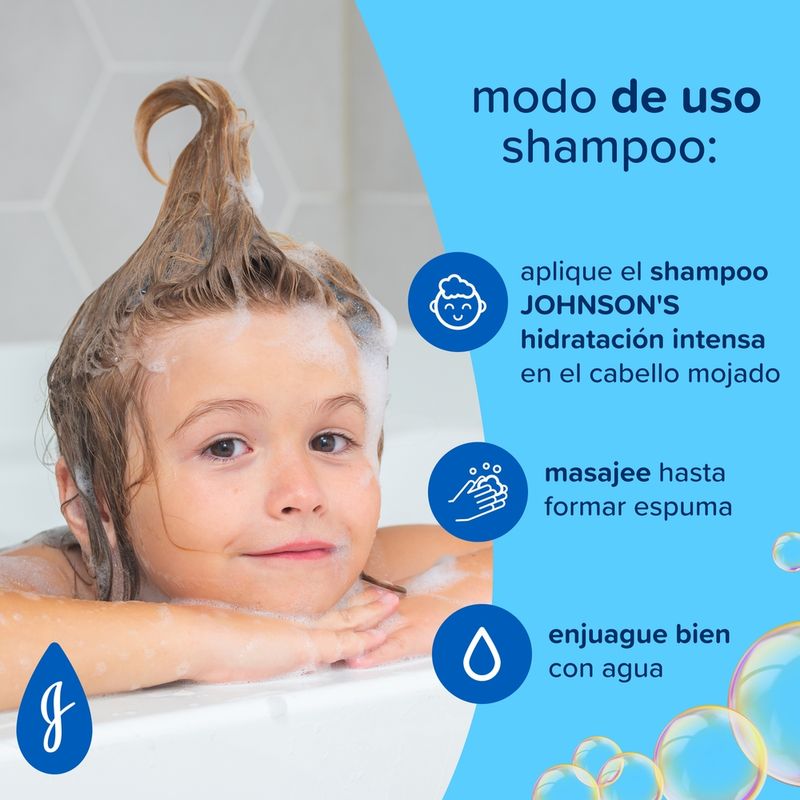 El Shampoo JOHNSONS Hidratación Intensa deja el cabello hidratado y fácil de peinar, gracias a su fórmula con 3 veces más agentes acondicionadores. Cuenta también con pH fisiológico, es hipoalergénico y libre de colorantes, parabenos, sulfatos y ftalatos. Los resultados son todavía mejores cuando se usa junto al shampoo de la misma línea. Debe ser aplicado por un adulto o bajo la supervisión de uno. No utilizar en caso de que el cuero cabelludo presente irritaciones. Adecuado para su uso diario.