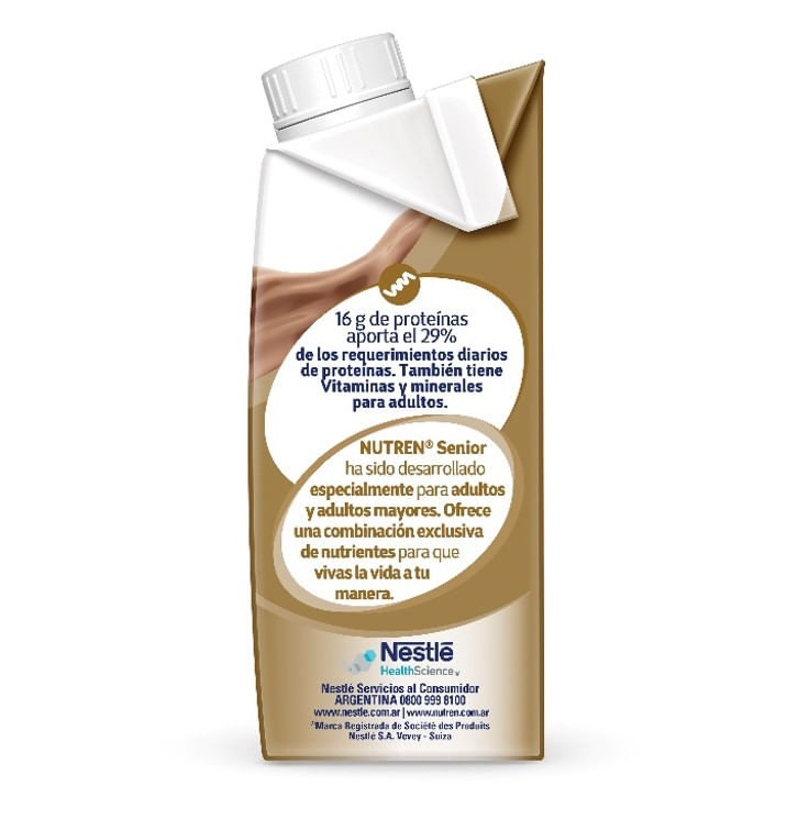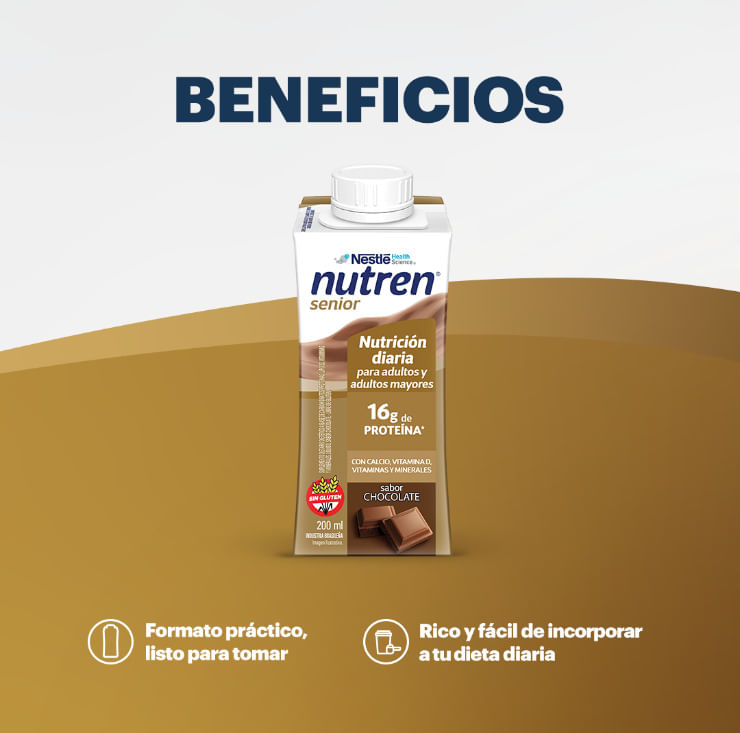 NESTLÉ NUTREN® SENIOR sabor Chocolate es un complemento nutricional líquido listo para tomar, pensado para adultos y adultos mayores que buscan recuperar y aportar a tu vitalidad, fuerza y bienestar cada día. Su formato individual de 200 ml, libre de lactosa, sin azúcar añadida y su sabor suave a vainilla lo convierten en la opción perfecta para cualquier momento del día.