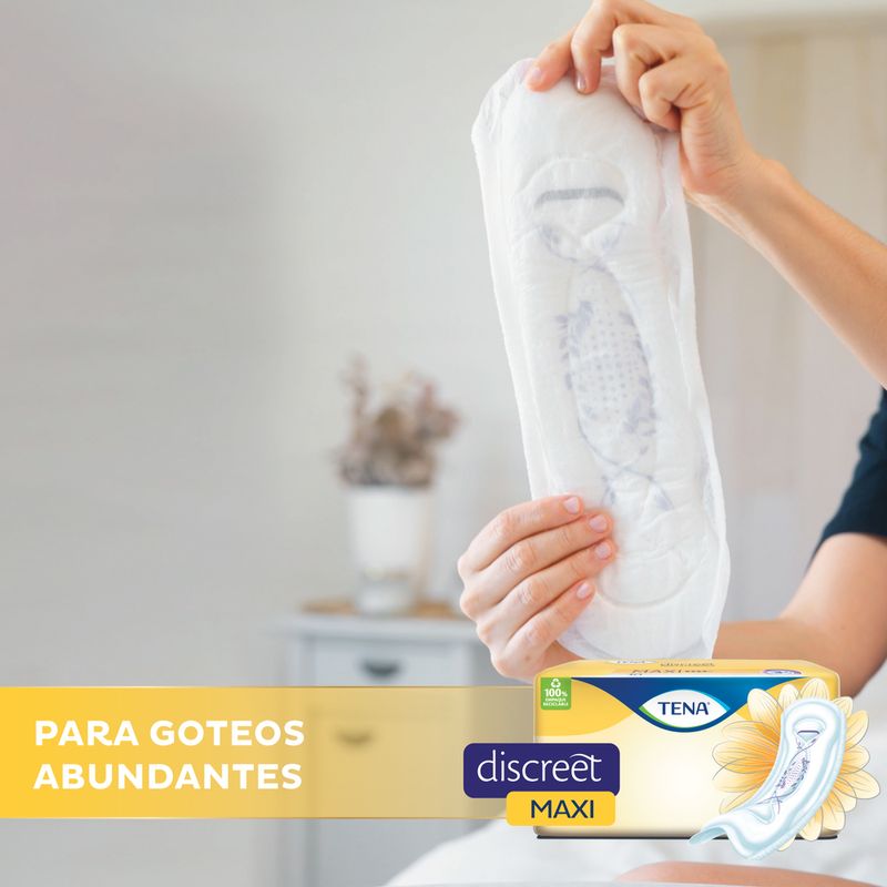 Toalla higiénica goteos abundantes de orina. Similar en tamaño y forma a una toalla higiénica nocturna. - Especializada para incontinencia, con tecnología que neutraliza el olor y absorbe más rápido que una toalla convencional para una zona íntima más fresca y seca por más tiempo. - Cubierta extra suave con la piel y materiales respirables para más frescura en la zona íntima. - Canales que distribuyen rápidamente la orina manteniendo la piel libre de humedad. - Dermatologicamente comprobado. - Mide 34cm de largo.